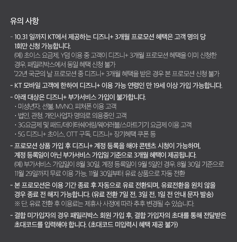 -이벤트 기간:2023. 8. 11(금) ~ 10. 31(화). -이벤트 혜택:디즈니+ 3개월 프로모션 혜택 (3개월 이후 자동 유료 전환). -이벤트 대상:패밀리박스 최신 버전을 이용중인 KT 모바일 고객 (기간내 신청 필수). ※ 패밀리박스 최신버전: iOS 5.0.0 / Android 5.0.1 (앱 스토어에서 확인 가능). -신청 방법: STEP. 1 아래 ‘혜택 신청하기’ 버튼 클릭. STEP. 2 kt.com 로그인 후 부가서비스* 신청 버튼 클릭. * 디즈니+(프로모션/3개월). STEP. 3 신청 완료 후, 계정등록 안내 문자(SMS) 수신. STEP. 4 문자 내 링크를 통해 디즈니+ 앱에서 계정 등록 후 이용 가능.